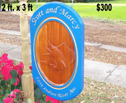 A SIGN FOR YOUR HOME OR ESTATE Here is a gorgeous mahogany residential home sign we made for a guy who likes to go offshore fishing. He told all his friends about it and they like it too, So lately we have been doing a lot of fishing themes residential and cabin signs like Bass and trout fishing. Elk and Deer are also popular with the outdoor guys and gals. We also have worked up a good collection of horse motif residential home signs and for carved front entry doors too. SIGN COST If you would like to add a real touch of class to your home or estate just give us a call and I think you will be surprised at how reasonable our prices are for these genuine works of art. The sign pictured above only cost $300.00 Residential signs can be as simple or as elaborate as you prefer. CUSTOM AIRBRUSHED COLOR If you don't care for all natural wood we can also airbrush our wood sculptures in colorful paints that will stand out for years to come. We have a full selection of colors and gifted artist who will see to it you are satisfied. You can have your artwork airbrushed and hand painted in solid colors and we also have no problem with metallic's and candy colors Kameleon colors or flip-flop. Just ask when you call about custom paint. MATCH THE COLOR OF YOUR SIGN TO YOUR HOUSE We work in custom automotive finishes and 24 k gold leaf. We can also match your carved wood signs colors to your